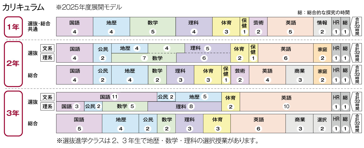 1年次の選抜進学・総合進学のクラス編成は、入学前に実施される基礎学力試験(英数国)等をベースに行います。このクラス編成は「緩やかな習熟度別クラス」の編成を目指したものです。個人の必要や希望に応じて効果的な学習を進めるための仕組みになっており、授業の時間数や教科書などはほぼ共通です。1年次末には特進コースへのコース変更制度もあります。